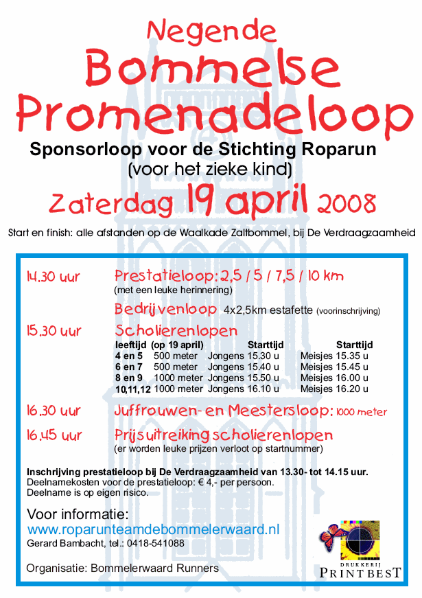 Het volledige programma van de Promenadeloop kunt u op deze website lezen. Basisscholen, prestatielopers en bedrijven die meer informatie wensen, kunnen contact opnemen met Gerard Bambacht (tel. 0418 – 541088).